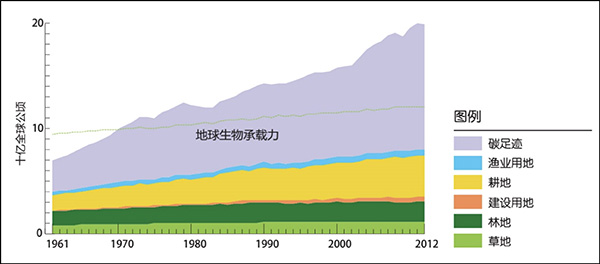 全球生態(tài)足跡構(gòu)成及地球的生物承載力。