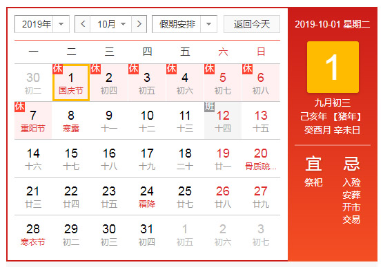 2019 年 10 月1 日(星期二)至 2019 年 10 月 7 日(星期一)放假,共 7 天; 9月29日(星期天)和10月12日(星期六)上班,10月8日(星期二)開(kāi)始正常上班。