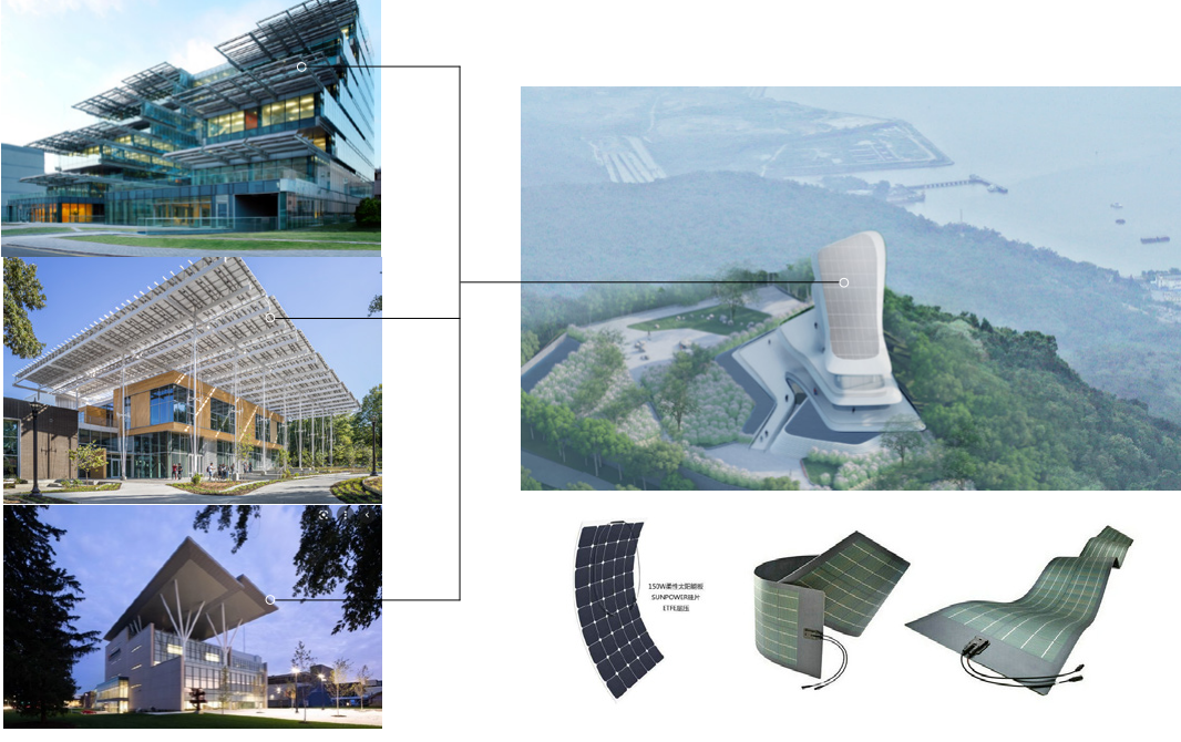 在綠色節(jié)能設(shè)計(jì)方面,建筑屋頂采用柔性太陽(yáng)能光伏發(fā)電板滿(mǎn)鋪模式。綠色低碳,節(jié)能減排,是響應(yīng)國(guó)家減碳降排、綠色節(jié)能的建筑設(shè)計(jì)要求。