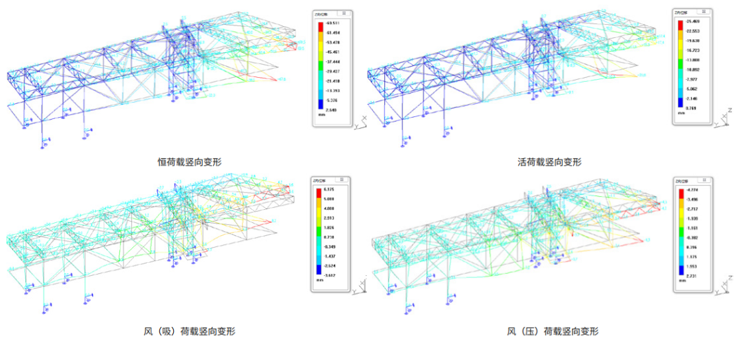 大懸梁和受力支點(diǎn)偏心為結(jié)構(gòu)特點(diǎn),以風(fēng)荷載、豎向荷載控制為主,主梁采用鋼結(jié)構(gòu)框架,經(jīng)分析論證,建筑物的抗風(fēng)能力能夠防范 12 級(jí)以上的臺(tái)風(fēng)。