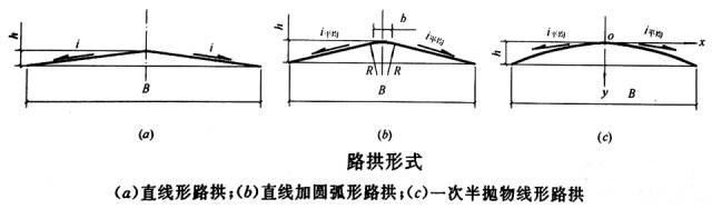 c)由于車(chē)行道寬度較大,為盡快排除地面水,車(chē)行道一般都采用雙向坡面,由道路中心線向兩側(cè)傾斜,形成路拱。拱頂?shù)綔系椎母叨确Q(chēng)為路拱矢高或路拱高度。