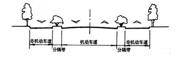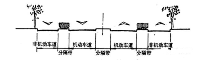 以?xún)蓷l分隔帶隔離機(jī)動(dòng)車(chē)與非機(jī)動(dòng)車(chē)車(chē)道,將車(chē)行道一分為三的橫斷面形式。