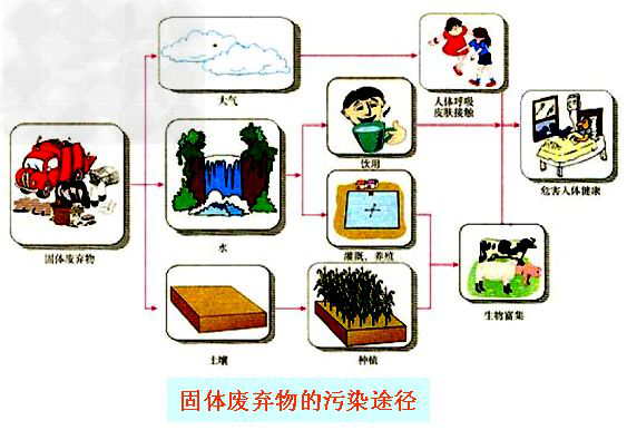 固體廢物特別是有害固體廢物能通過不同途徑危害人體健康。通常,工礦業(yè)固體廢物所含化學(xué)成分能形成化學(xué)物質(zhì)型污染、人畜糞便和生活垃圾能形成病原體型污染。