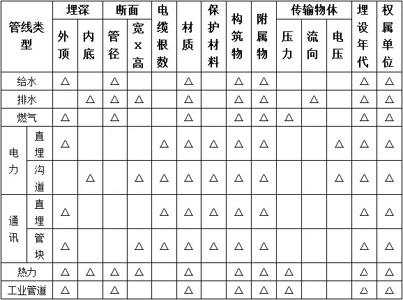 地下管線調(diào)查應(yīng)在地下管線現(xiàn)況調(diào)繪圖所標(biāo)示各類地下管線位置的基礎(chǔ)上,通過對所出露的地下管線及附屬設(shè)施按下表的調(diào)查項(xiàng)目要求詳細(xì)核查地下管線及其附屬物的各屬性,做好記錄和量測。