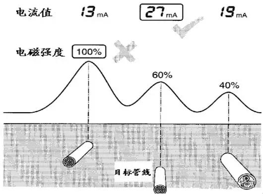 當(dāng)用直接法工作時(shí),被施加信號(hào)的目標(biāo)管線上電流最大,而其它并行管線電流為感應(yīng)電流,電流值較小,通過測量出電流值大小方法區(qū)分出目標(biāo)管線。(如圖)