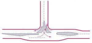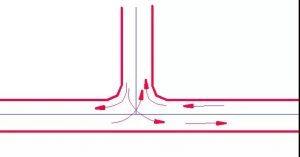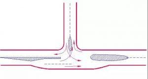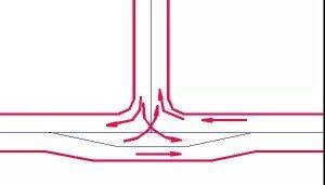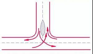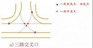 三路相交的交叉口,3個(gè)沖突點(diǎn)、3個(gè)合流點(diǎn)、分流點(diǎn)。