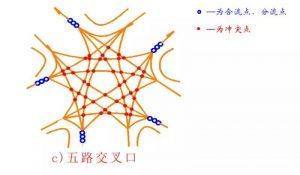 五路交叉口,50個(gè)沖突點(diǎn)、8個(gè)合流點(diǎn)、分流點(diǎn)。