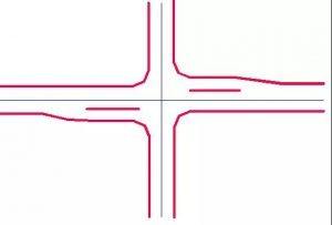 右轉(zhuǎn)車道:在進(jìn)道口右側(cè)或同時(shí)在出道口右側(cè)擴(kuò)寬