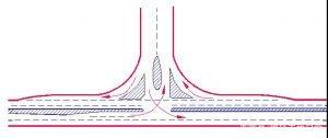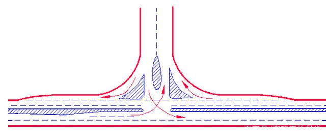 主要公路與次要公路的T形交叉,當(dāng)轉(zhuǎn)彎交通量較大而會(huì)導(dǎo)致直行車輛的過分減速時(shí),應(yīng)采用加寬式T形交叉左轉(zhuǎn)彎交通量較大者,可采用該型式。
