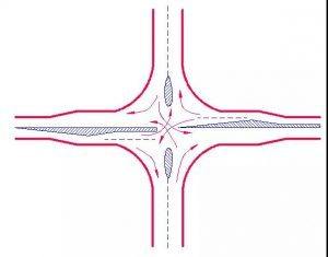 采用環(huán)形交叉(俗稱轉(zhuǎn)盤),使進(jìn)入交叉口后的車輛按逆時(shí)針方向環(huán)繞中心島作單向行駛至駛出口,均以同一方向循序前進(jìn),消滅交叉口的沖突點(diǎn)。