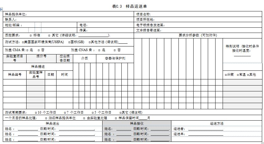 每份樣品從采樣到送至實驗室都應(yīng)該有一個完整的樣品追蹤監(jiān)管程序,主要包括:樣品的收集、運輸、處理和相關(guān)人員的信息;樣品采集日期、時間、深度等記錄數(shù)據(jù);樣品分析項目等其他信息。樣品流轉(zhuǎn)清單樣式可參考表C.3。