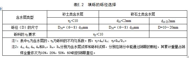 礫料的礫徑,應(yīng)根據(jù)含水層顆粒篩分數(shù)據(jù)確定,可參照表E.2選用。