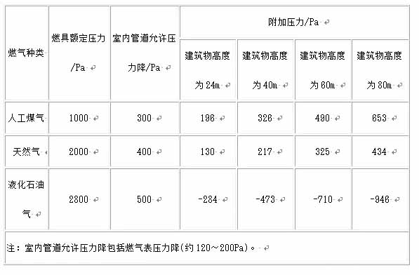 燃?xì)夥N類 燃具額定壓力/Pa 室內(nèi)管道允許壓力降/Pa 附加壓力/Pa 建筑物高度為24m 建筑物高度為40m 建筑物高度為60m 建筑物高度為80m 人工煤氣 1000 300 196 326 490 653 天然氣 2000 400 130 217 325 434 液化石油氣 2800 500 -284 -473 -710 -946 注:室內(nèi)管道允許壓力降包括燃?xì)獗韷毫?約120~200Pa)。