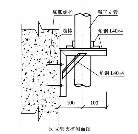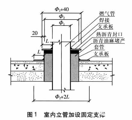 ① 對(duì)于室內(nèi)立管,在每隔7~10層的穿樓板處加設(shè)固定支撐,使燃?xì)夤艿?、套管以及建筑物成為一體。具體做法見圖1(圖中單位為mm)。