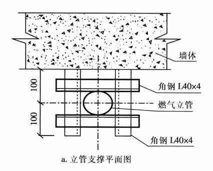 隨著建筑物層數(shù)的增加,燃?xì)饬⒐艿拈L度也變長,管道的自重變大,所以應(yīng)設(shè)置管道的固定支架,使固定支架與建筑物成為一體,防止因管道下沉而引起引入管受力折斷或變形引起倒坡。一般固定管道的做法有: