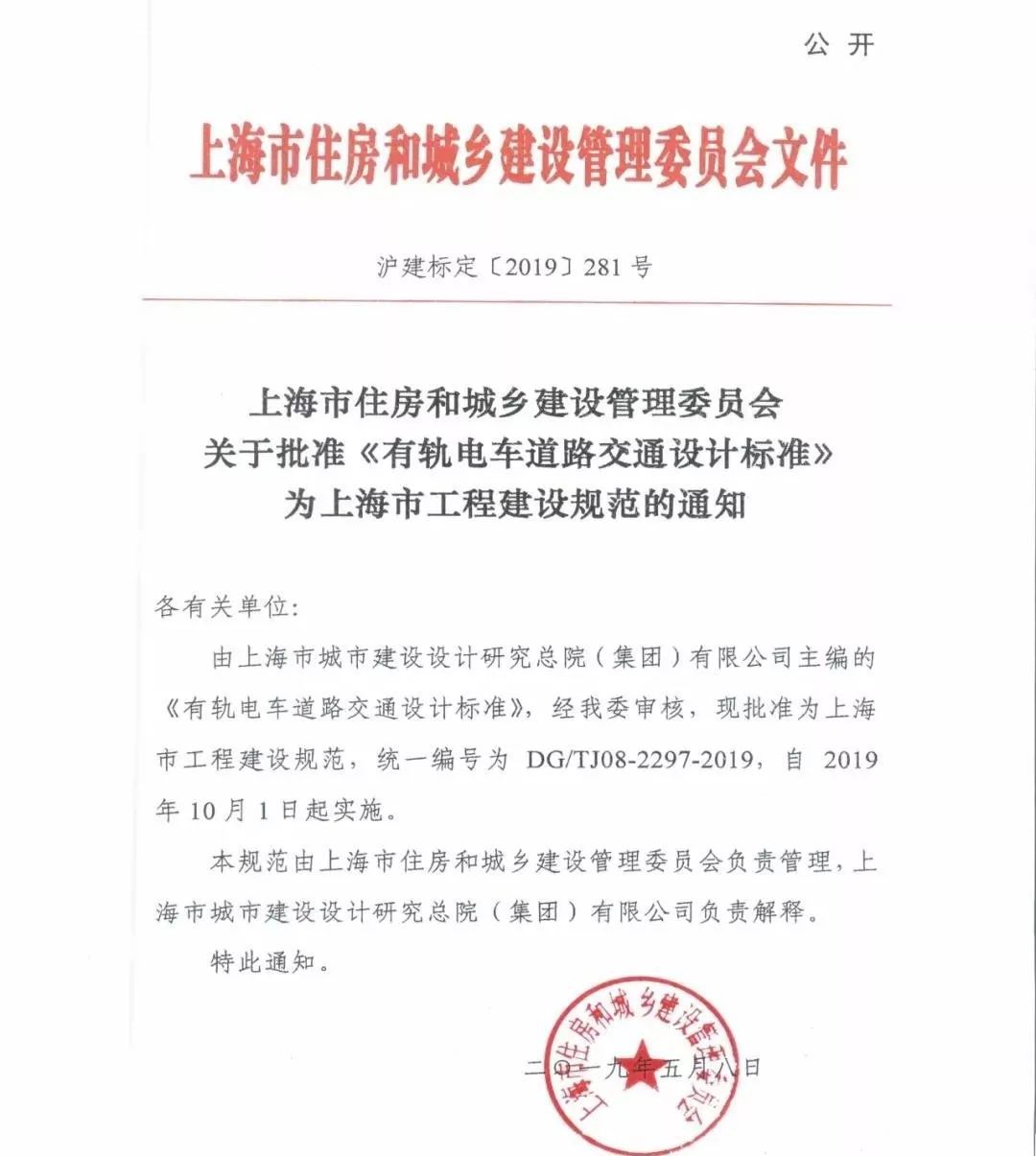 近日,上海市工程建設規(guī)范《有軌電車道路交通設計標準》DG/TJ08-2297-2019(以下簡稱“標準”)發(fā)布。標準由上海市城市建設設計研究總院主編,于2019年10月1日正式實施。