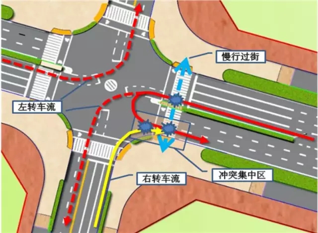 特征分析:只能在左轉(zhuǎn)相位允許時(shí)使用,占用交叉口展寬資源,易與行人過街及對向右轉(zhuǎn)車形成干擾。