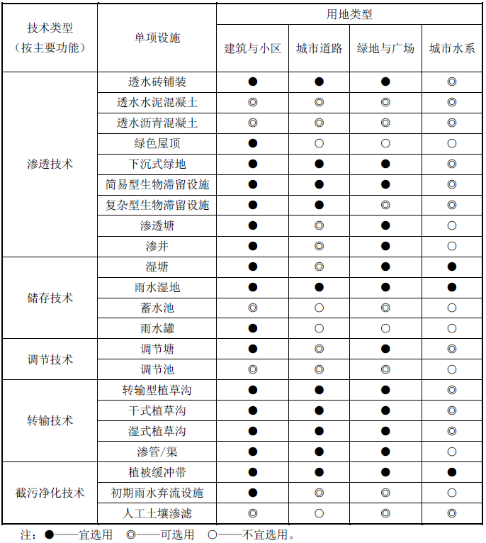 表1  各類用地中低影響開發(fā)設(shè)施選用一覽表