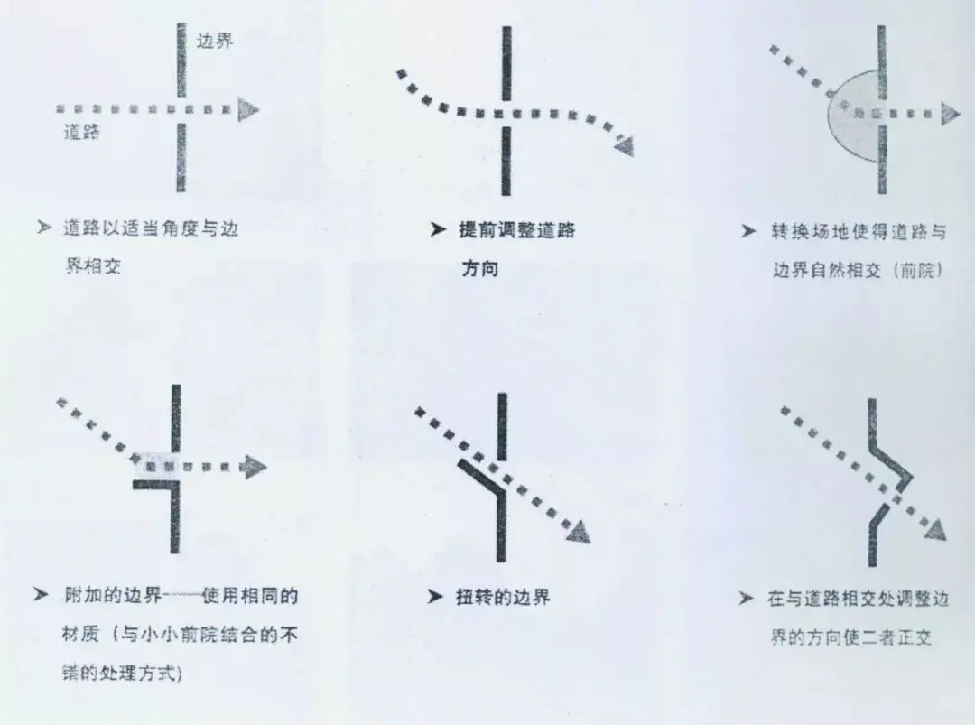 道路與邊界應(yīng)讀以適當(dāng)?shù)慕嵌认嘟?。如果道路需要旋轉(zhuǎn)一定方向與邊界相交,可以提前做適當(dāng)?shù)奶幚?。包括提前調(diào)整道路的角度,在邊界前留出一塊轉(zhuǎn)換空地或者使得邊界與道路的方向相呼應(yīng)。