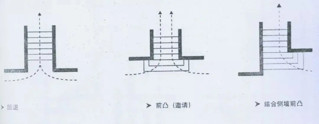 臺(tái)階以為著強(qiáng)烈的指向。在臺(tái)階上下的區(qū)域應(yīng)當(dāng)做特殊處理以表明方向的改變。因此,建筑邊沿的臺(tái)階應(yīng)當(dāng)向前延伸(公共性、邀請(qǐng)感)或者向后退縮(私密性、限制感),其他景觀看見宜同。