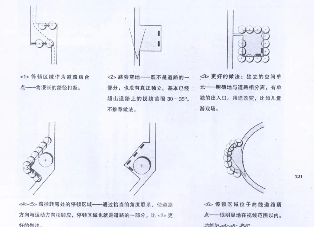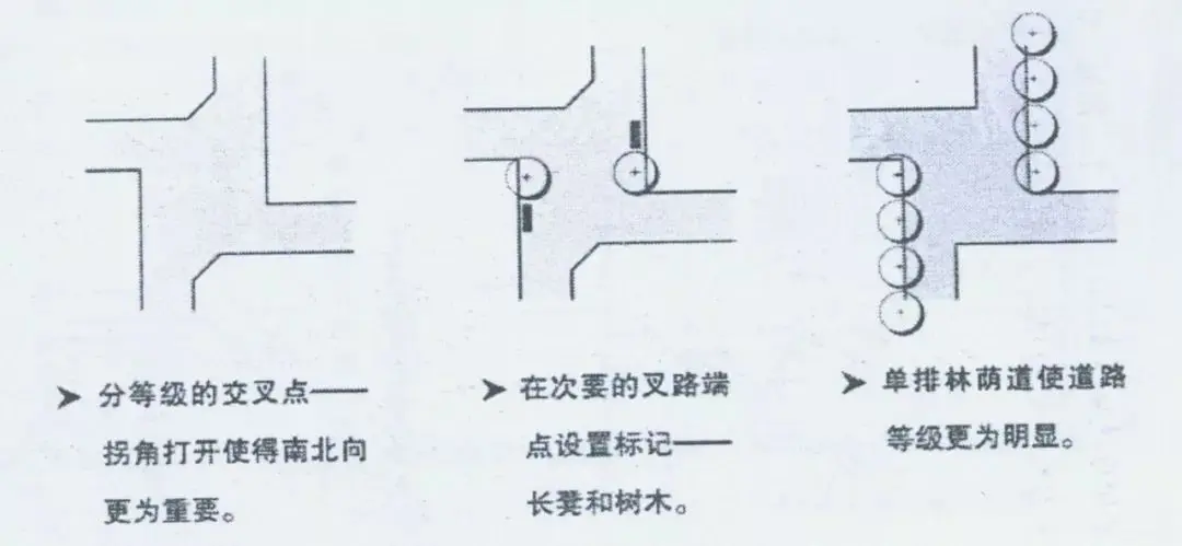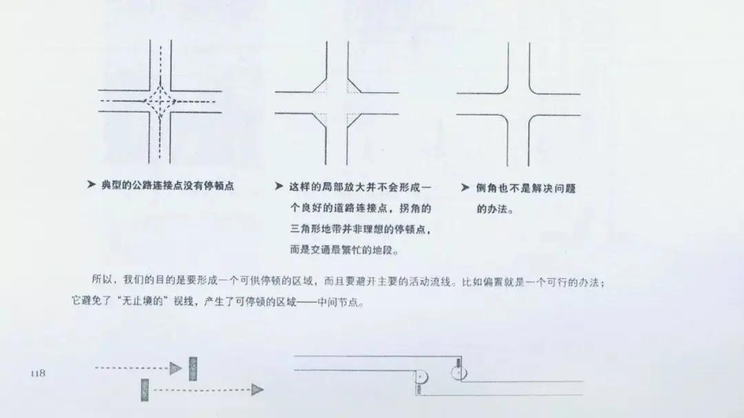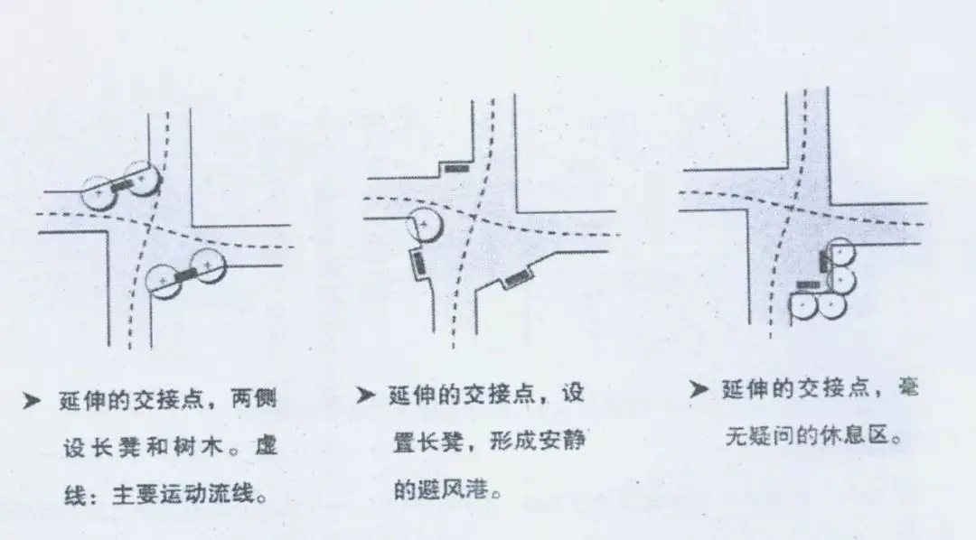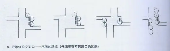 道路連接點(diǎn)與公路連接點(diǎn)不同,需要一些停頓區(qū)域。使用者在此稍作停頓,觀察選擇自己的運(yùn)動(dòng)方向。因此,連接點(diǎn)需要在交叉路口加寬,有足夠的空間。但是僅僅加寬道路并不會(huì)自動(dòng)產(chǎn)生一個(gè)宜人的道路連接點(diǎn)。