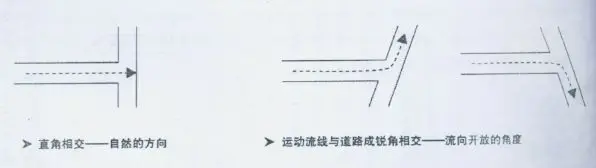 如果運(yùn)動(dòng)流線與線性構(gòu)筑物(道路,空間邊界等)相交角不是自然的正交,運(yùn)動(dòng)流線就會(huì)自動(dòng)導(dǎo)向開放的“鈍角”一側(cè)。