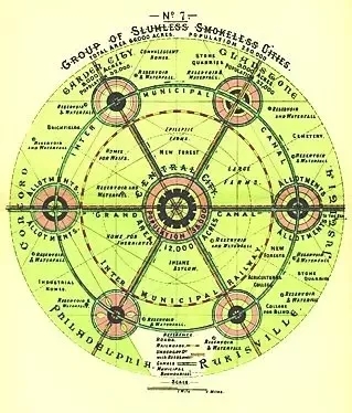 霍華德在世紀(jì)之交時(shí)(20世紀(jì)初)提出一個(gè)解決工業(yè)城市擁擠和嚴(yán)重污染的方法,他的解決方案的核心是在永久的綠化帶中創(chuàng)造一個(gè)集中在通過運(yùn)河和交通工具連接起來的更小的“花園城市”(每個(gè)城市有3.2萬人)。