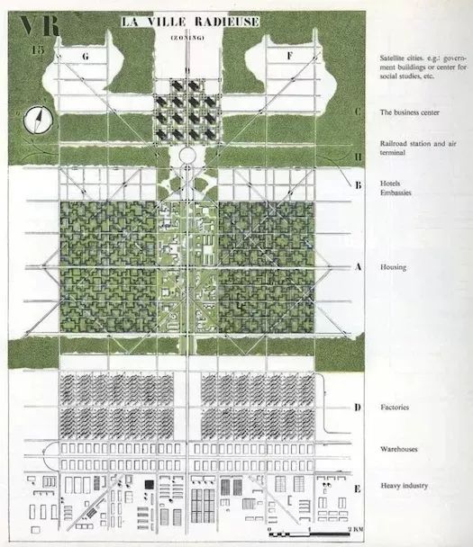 他的方案,也被稱為“公園中的塔”,名副其實(shí):無數(shù)的高層建筑,每一個(gè)都被綠色空間包圍。每一棟建筑都被規(guī)劃師戲稱為“超級街區(qū)”,空間被清晰地劃分為不同的用途(在上圖中包括“住宅”、“商業(yè)中心”、“工廠”和“倉庫”)。