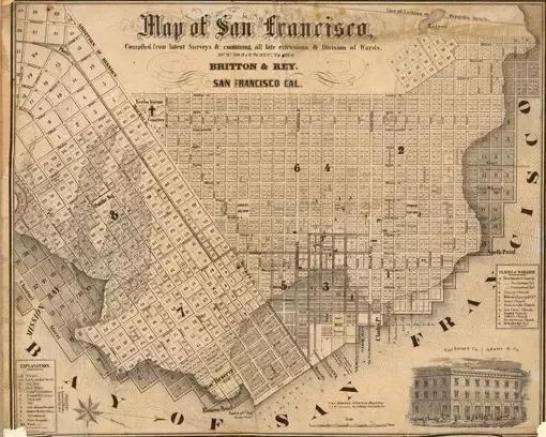 1811年曼哈頓專員的計(jì)劃試圖建立一個(gè)嚴(yán)格的街道網(wǎng)格,以發(fā)展島上的其他地區(qū)。幾十年后,這幅1852年的地圖顯示舊金山也做了同樣的事情,為了出于方便忽略了這個(gè)城市不規(guī)則的海岸線和地形。