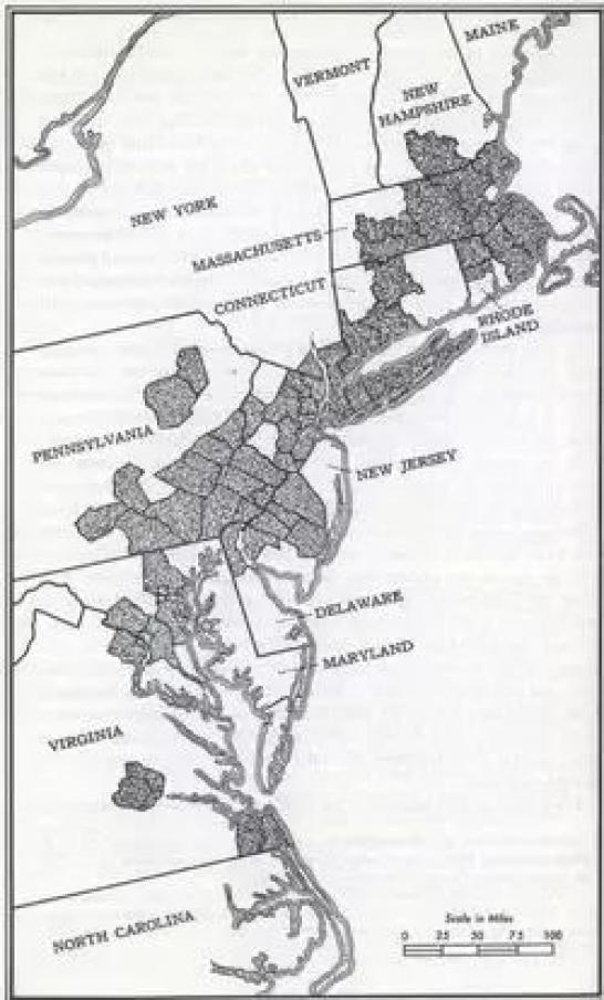 如今,規(guī)劃人員越來越多地談?wù)撆c交通、經(jīng)濟(jì)和環(huán)境有關(guān)的問題,而在規(guī)模上脫離了社區(qū)和城市,整個(gè)地區(qū)被多個(gè)地鐵連接在一起。不過,“大都市圈”的概念并不新鮮。這張1961年吉恩·戈特曼所著《大都市》一書中的地圖,展示了華盛頓特區(qū)東北部到波士頓一個(gè)連綿不斷的超大區(qū)。