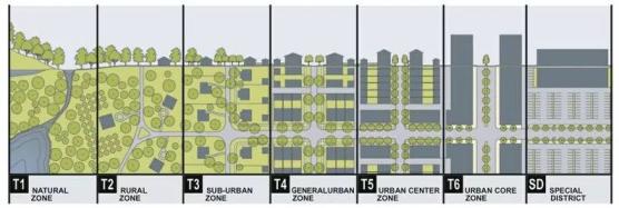 城市斷面圖被規(guī)劃人員作為劃分景觀層次的一種可視化多用途工具。這幅由建筑師安德雷斯·杜安伊創(chuàng)作的特別的作品,展示了自然和密集的城市區(qū)域之間的鄉(xiāng)村到城市的漸變,這已經(jīng)成為新城市主義者的一個(gè)流行架構(gòu)。