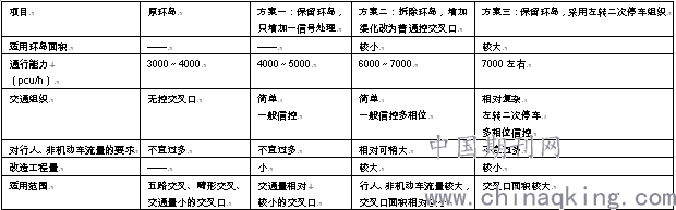 根據(jù)以上分析的環(huán)形交叉口可進(jìn)行的改造方案,對(duì)各個(gè)方案見(jiàn)進(jìn)行比較,結(jié)果如下表1。