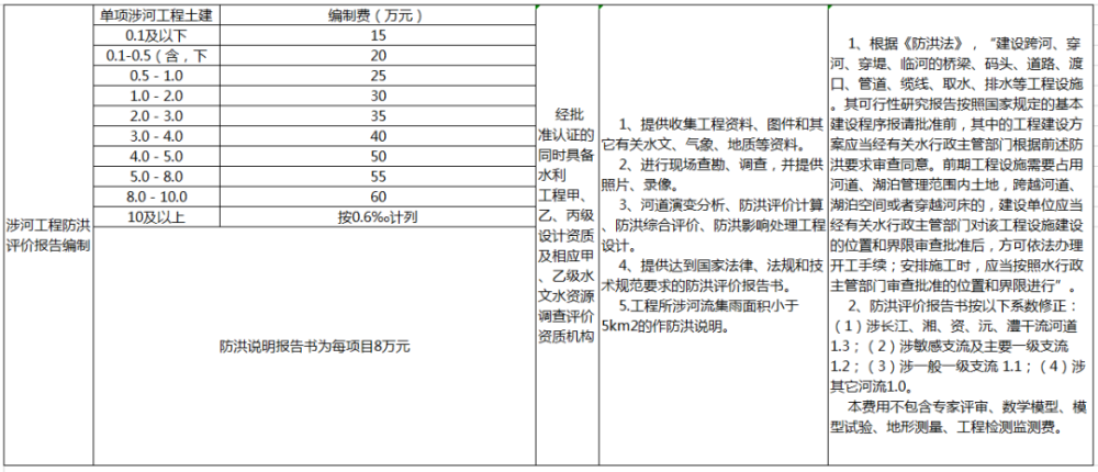 防洪評(píng)價(jià)咨詢(xún)?nèi)≠M(fèi)可參考地方收費(fèi)標(biāo)準(zhǔn),如湖南省地方標(biāo)準(zhǔn)——《湖南省物價(jià)局、湖南省水利廳關(guān)于公布水利系統(tǒng)服務(wù)性收費(fèi)項(xiàng)目和標(biāo)準(zhǔn)的通知》(湘價(jià)服〔2013〕134號(hào)),具體如下: