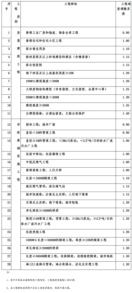 工程復(fù)雜程度分為一般、較復(fù)雜和復(fù)雜三個(gè)等級(jí),其調(diào)整系數(shù)分別為:一般(Ⅰ級(jí))0.85;較復(fù)雜(Ⅱ級(jí))1.0;復(fù)雜(Ⅲ級(jí))1.15。