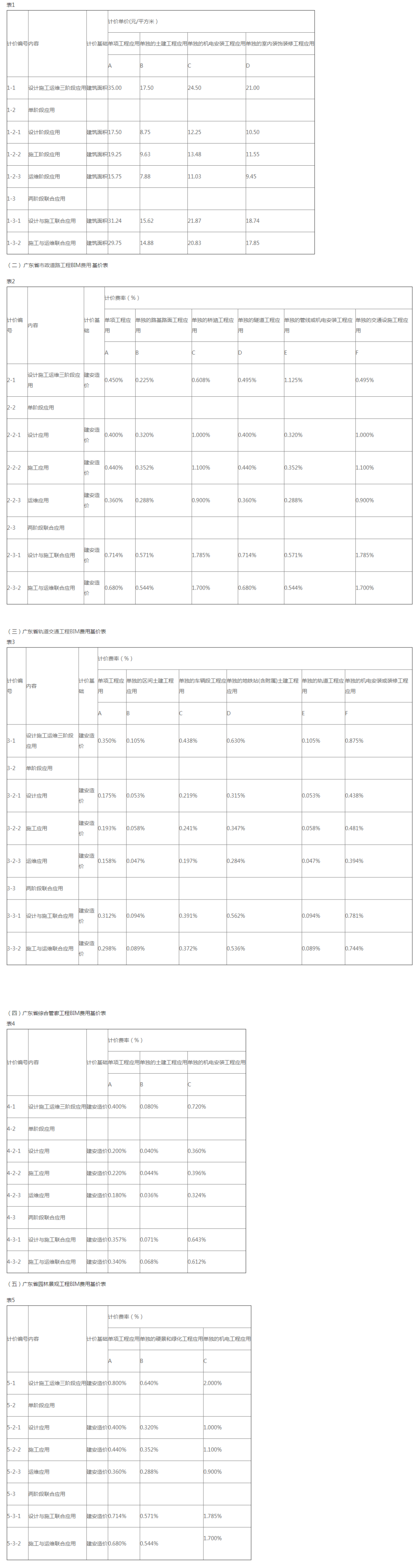 (2)工業(yè)與民用建筑工程,當(dāng)建筑面積少于2萬(wàn)平方米時(shí),按2萬(wàn)平方米作為計(jì)價(jià)基礎(chǔ)計(jì)算建筑信息模型(BIM)技術(shù)應(yīng)用費(fèi)用;市政道路工程、軌道交通工程、地下綜合管廊工程的造價(jià)少于1億元時(shí),按1億元作為計(jì)價(jià)基礎(chǔ)計(jì)算建筑信息模型(BIM)技術(shù)應(yīng)用費(fèi)用;園林景觀工程的造價(jià)少于1000萬(wàn)元時(shí),按1000萬(wàn)元作為計(jì)價(jià)基礎(chǔ)計(jì)算建筑信息模型(BIM)技術(shù)應(yīng)用費(fèi)用。