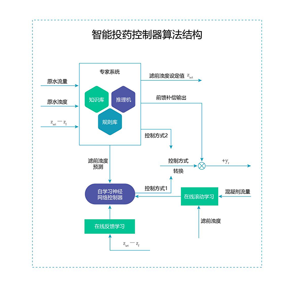 首先通過前饋專家模型采集分析源水流量、濁度、 PH 值 等數(shù)據(jù)信息并快速建模,再利用人工神經(jīng)網(wǎng)絡(luò)對模型進(jìn)行深度學(xué)習(xí),通過多步預(yù)測、滾動(dòng)優(yōu)化和反饋校正識別出加藥量和變量之間的對應(yīng)關(guān)系,最終得出最精準(zhǔn)的藥劑投加量?;苍浦悄芗铀幭到y(tǒng)可通過軟件平臺對工藝過程進(jìn)行全自動(dòng)監(jiān)控、診斷,投藥全程自動(dòng)化控制,設(shè)備故障自動(dòng)進(jìn)行切換控制;實(shí)現(xiàn)對設(shè)備運(yùn)行、藥劑消耗、水質(zhì)監(jiān)控等方面進(jìn)行實(shí)時(shí)診斷、數(shù)據(jù)分析、故障預(yù)測及報(bào)警 。